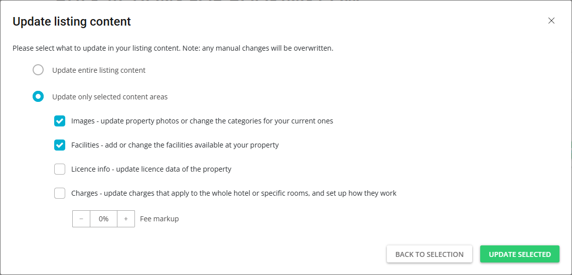 In the Update listing content section, select whether you want to update the entire listing content or specific content parts. If you choose Update only selected content areas option, select which content parts you want to update. Click Update selected.