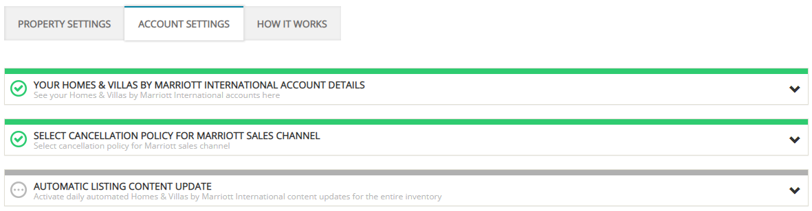 Listings that do not meet minimum requirements to connect will not be updated. In case your changes are not visible in the channel, make sure that your properties meet these criteria. Note that you will not see any notification in Homes & Villas by Marriott Bonvoy Property Settings if the property does not meet minimum content requirements.
