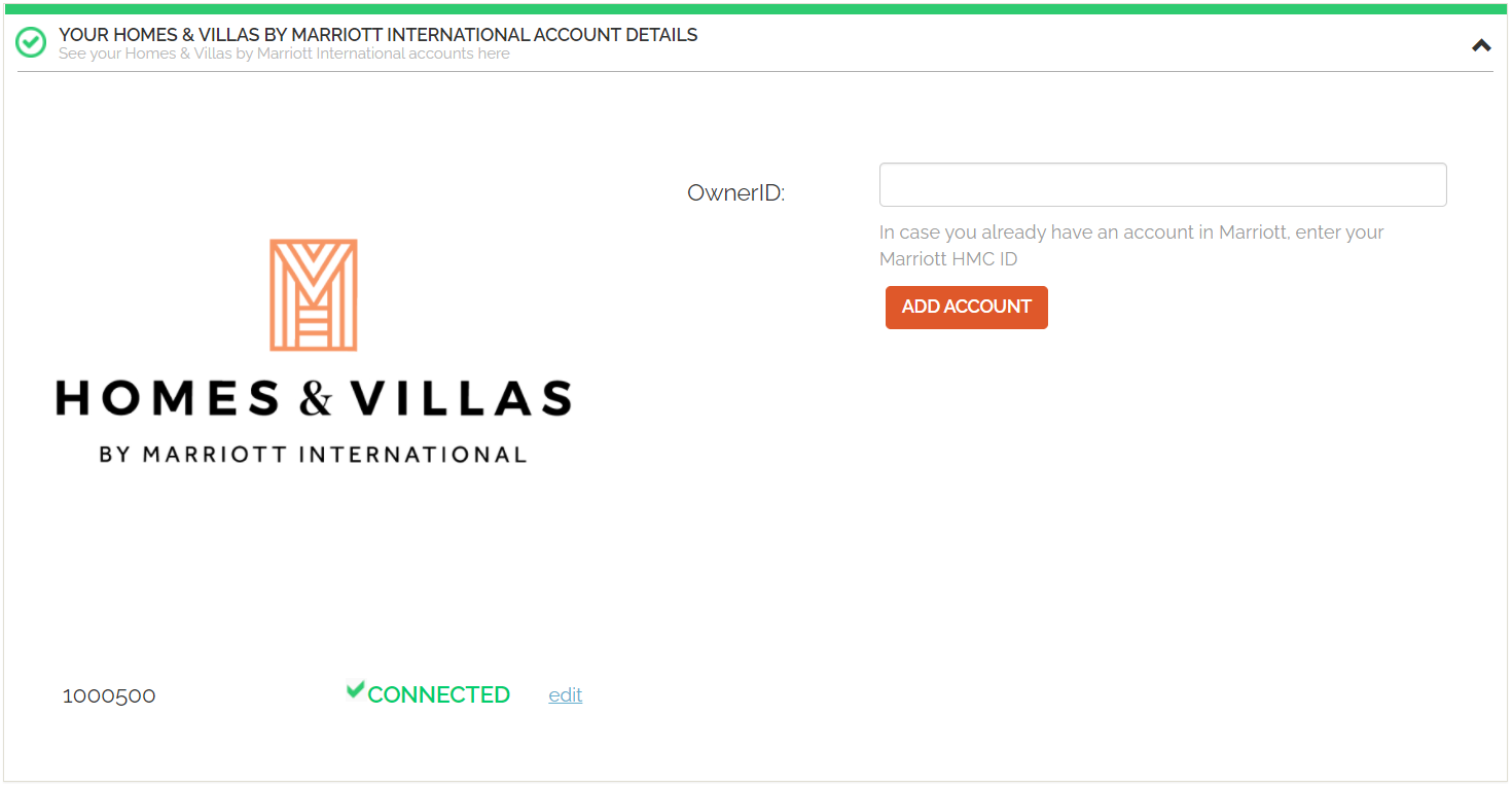 Select the Homes & Villas by Marriott Bonvoy account details section. If you want to link another account, provide the Homes & Villas by Marriott Bonvoy OwnerID and click the Add account button. If the validation is successful, the Property settings page can be opened and you can connect properties.