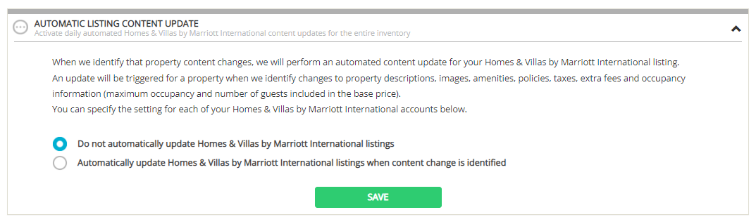 With Automatic listing content update, you can turn on an automatic property descriptive content update and make your connection to Homes & Villas by Marriott Bonvoy seamless. This means that whenever you edit your properties in Rentals United, the listings in Homes & Villas by Marriott Bonvoy will be automatically updated. Find the important information below:
