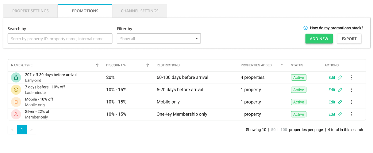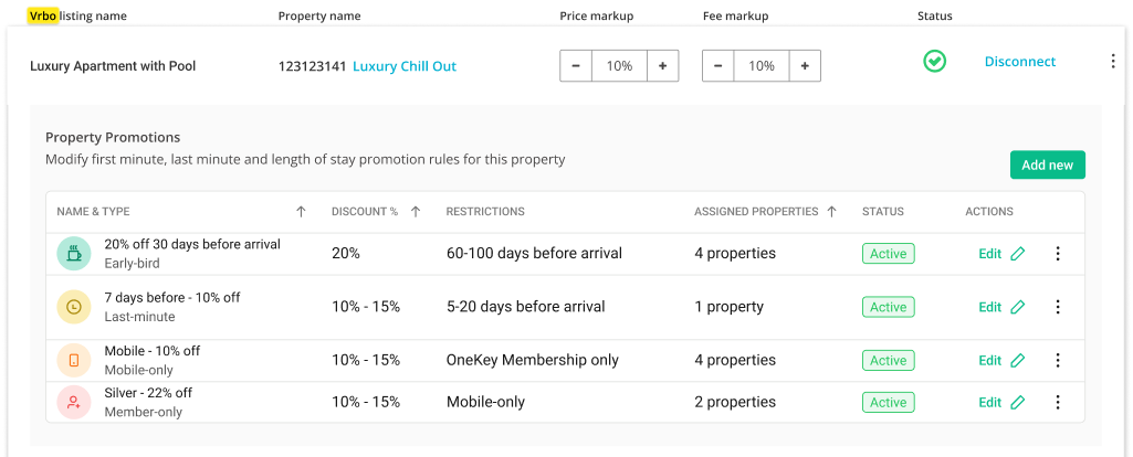• Promotions - for managing all your discounts for all your listings at once. View your discounts from the account’s perspective.