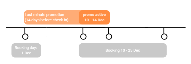 Example: You set a last minute promotion for stays booked within 14 days of the check-in date. If a guest books on December 1 a stay that spans December 10 - December 25, the discount will only apply to the first 4 days of the booking.