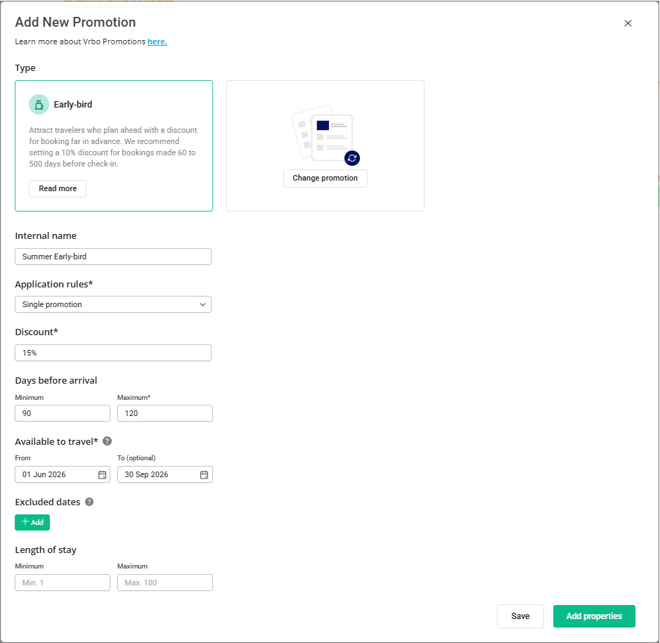 Promotions on Vrbo help your property stand out and attract the right guests at the right moment. They give you more control over visibility, targeting, and demand across different seasons. In this article you will learn about the Vrbo promotion types and how to set them up in Rentals United.