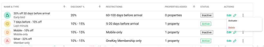 • Manage / Manage rates - for managing the discounts for a specific listing only.