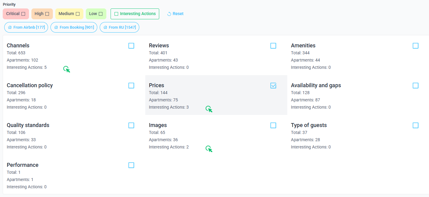Recomendaciones: Acceda a recomendaciones relativas a sus listados directamente desde Rentals United, Booking.com y Airbnb. Las recomendaciones se clasifican en niveles (crítico, alto, medio, bajo) y temas (disponibilidad y carencias, precios, canales, política de cancelación, etc.). Guarde las recomendaciones que le interesen para más adelante.