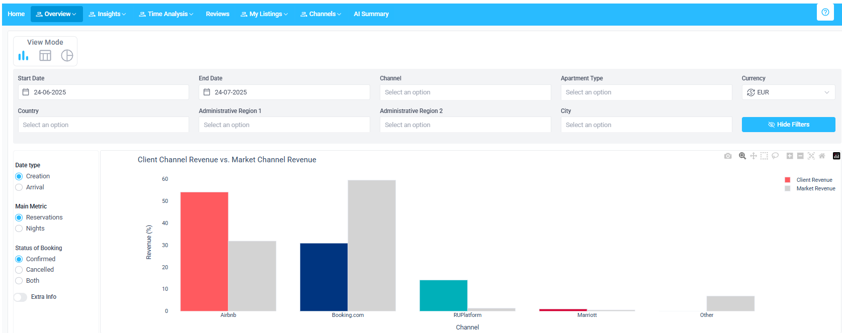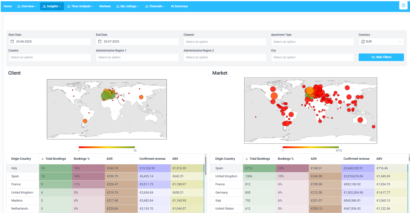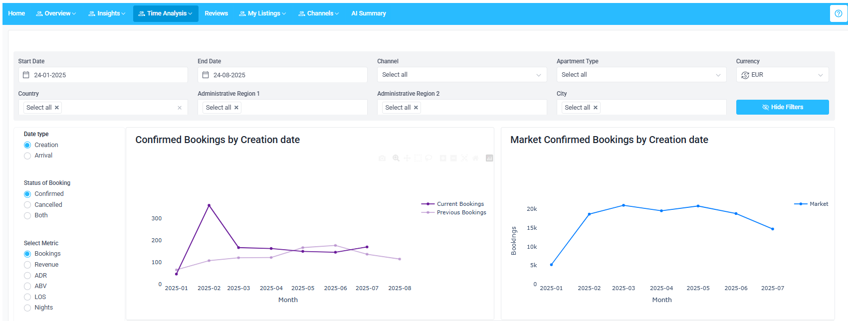 Seguimiento mensual de KPI: Visión general de sus reservas confirmadas y canceladas en comparación con la tendencia del mercado. ¿El mercado está cambiando? Compruebe si sus propiedades encajan en las tendencias y encuentre rápidamente la solución.