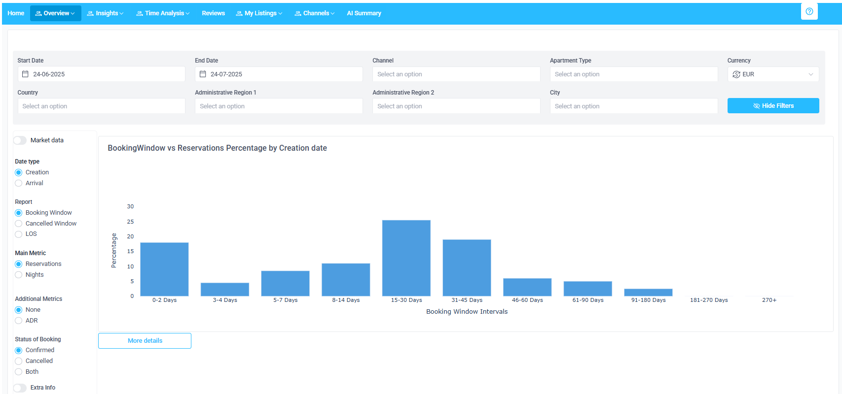 Comportamiento de las reservas: este informe incluye métricas de ingresos más avanzadas, como la ventana de reserva, la ventana de cancelación y la duración de la estancia en relación con el número de reservas. Conozca el comportamiento de sus clientes a la hora de reservar y ajuste los precios en consecuencia: ¿son de última hora o reservan pronto? ¿Reservan sus propiedades para estancias cortas o largas?