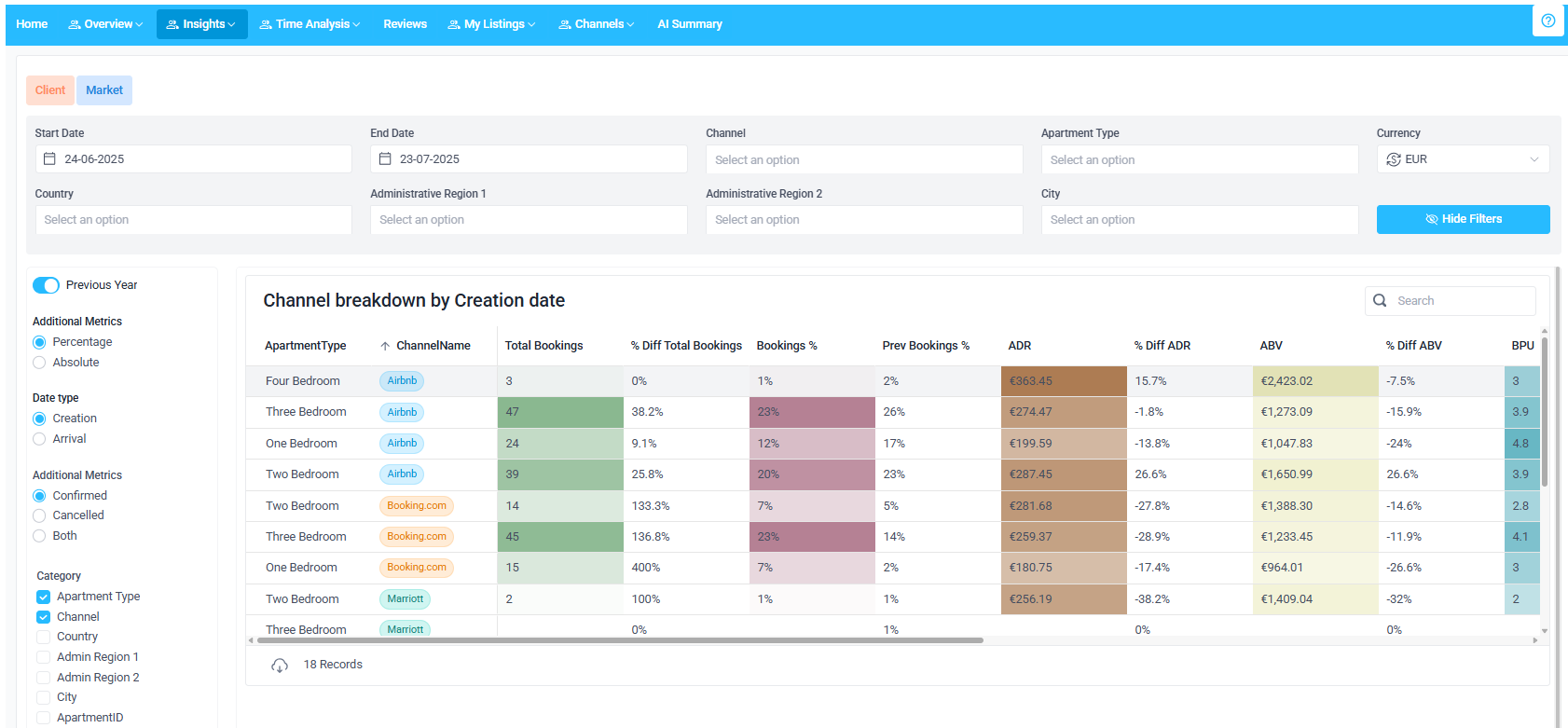 Analytics Builder: Compare el rendimiento de sus propiedades por variables seleccionadas. Consulte las estadísticas básicas (reservas totales, cuota de reservas, tarifas medias, duración media de la estancia, etc.) por canal de ventas, tipo de apartamento, país, etc Cree su informe personalizado e incluya las métricas que sólo le interesen. Por ejemplo, puede comparar fácilmente el rendimiento de sus apartamentos de dos dormitorios en Booking.com y Expedia e incluso compararlo con el histórico.