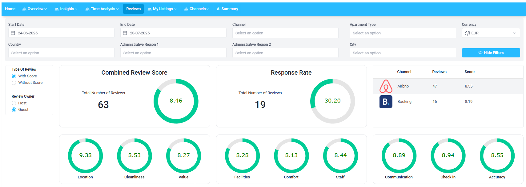 Reseñas: Utilice los comentarios de los huéspedes para profundizar en el análisis del rendimiento de sus propiedades, todo ello agregado en un único lugar desde Booking.com, Airbnb, Expedia y Vrbo. ¿Cuál es el punto débil que abordan sus clientes en las reseñas? Conozca los comentarios reales, utilícelos para realizar un seguimiento rápido de los problemas de su inventario y solucionarlos.