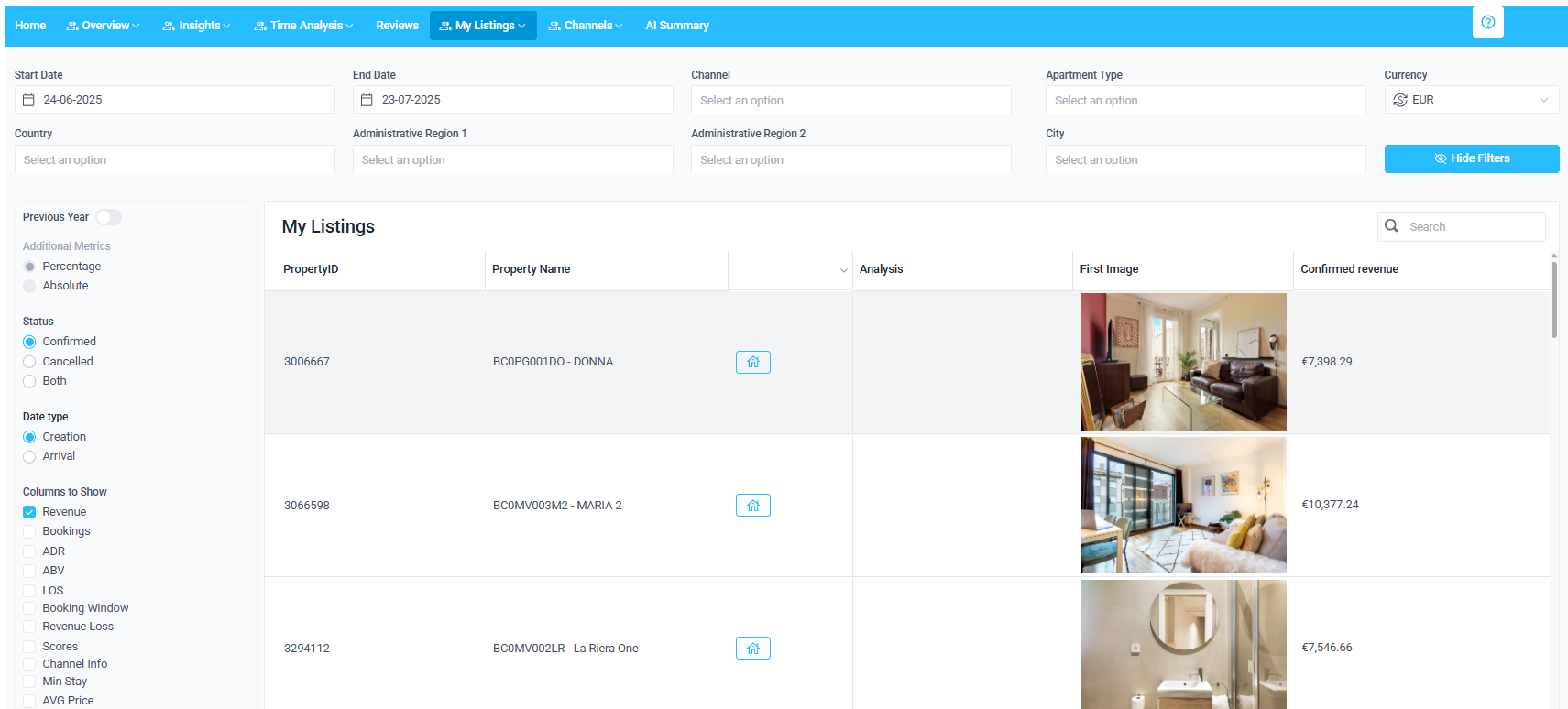Listados: Realizar un análisis a nivel de propiedad. Conozca el rendimiento de cada una de sus propiedades (ingresos, número de reservas, tarifas medias, duración media de la estancia, etc.). Compare con otras propiedades y realice un seguimiento del inventario de bajo rendimiento.