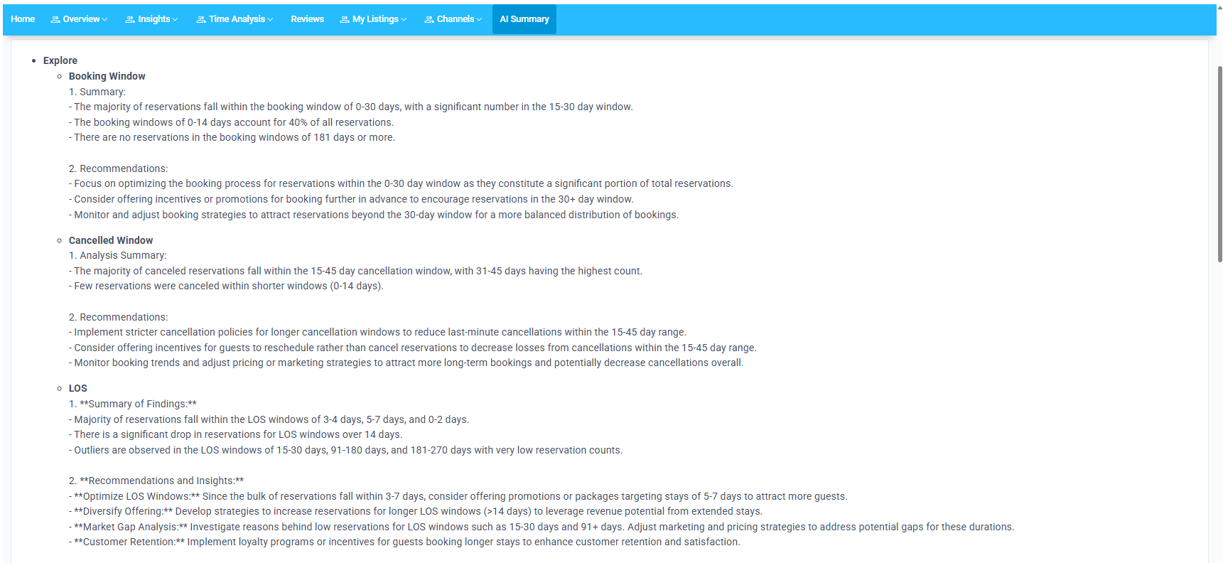 Además, Analítica le da acceso a algunas funciones inteligentes, que le permiten comparar sus datos actuales con los registros históricos y los datos de mercado en tiempo real (datos de otros administradores de fincas en su mercado). Analítica también utiliza una solución con IA incorporada que analiza sus anuncios y le ofrece consejos y recomendaciones sobre cómo mejorar su rendimiento y aumentar sus ingresos.