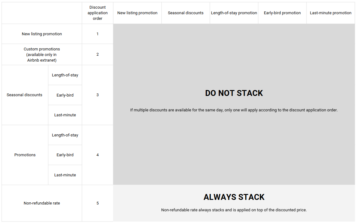 • Si tiene varios descuentos del mismo tipo (por ejemplo, semanal y mensual), se aplicará el que sea más beneficioso para el huésped.