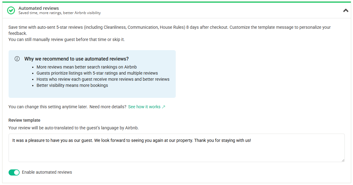 Con las reseñas totalmente automatizadas, se traduce, envía y publica una reseña preestablecida en Airbnb 8 días después de la salida de su huésped. No es necesario realizar ninguna acción a menos que desee escribir una reseña personalizada para un invitado específico u omitirla.