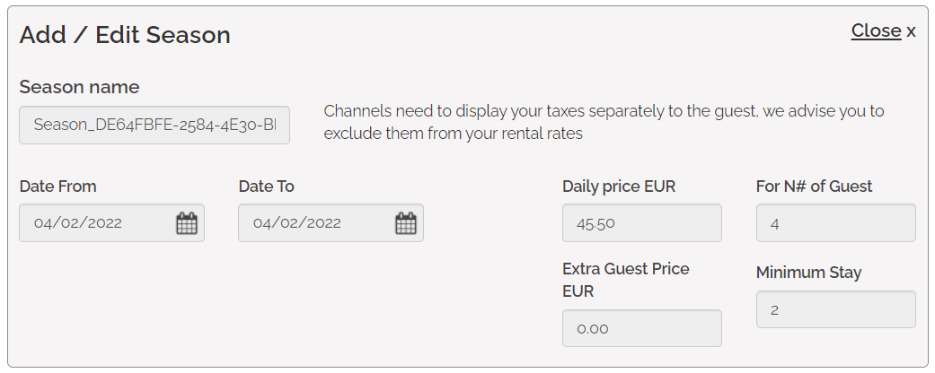 Si vous utilisez le modèle Tarif LOS et que vous disposez des prix LOS fournis dans Bungalow, vous devez savoir que ces prix seront convertis en prix FSP dans Rentals United. Cela signifie seulement qu'ils seront disponibles dans une section différente sur Rentals United, mais il ne devrait pas y avoir de différences entre vos prix sur Bungalow et Rentals United.
