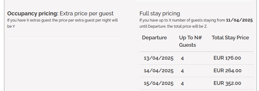 Si vous utilisez le modèle Tarif LOS et que vous disposez des prix LOS fournis dans Bungalow, vous devez savoir que ces prix seront convertis en prix FSP dans Rentals United. Voir ci-dessous.
