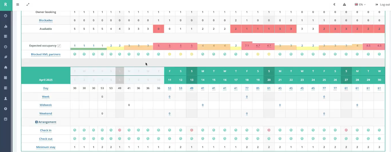 Le calendrier correspond à la disponibilité de la propriété à la location. Vous pouvez vérifier ici la disponibilité de votre propriété dans les périodes sélectionnées. Une fois qu'une réservation est insérée dans Rentals United, la disponibilité dans le calendrier est bloquée pour cette période. Le calendrier est mis à jour automatiquement chaque fois que la disponibilité de la propriété change ou à des moments prédéfinis pour rester à jour.
