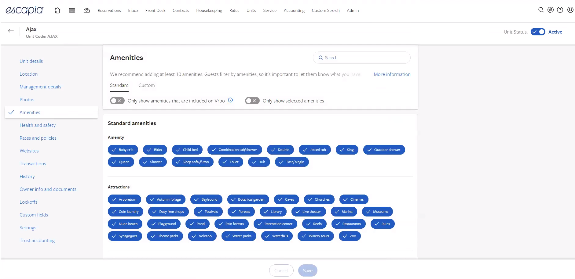 Sur Escapia: Unités > Sélectionnez une propriété > Commodités > Standard