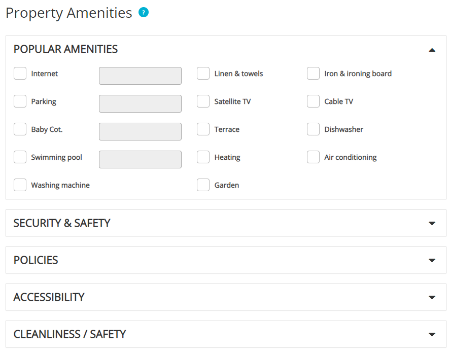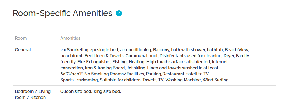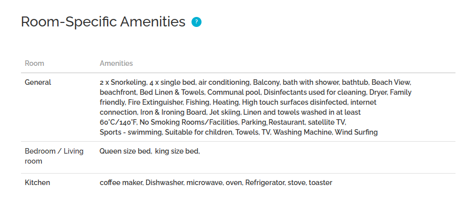 Les équipements de la propriété sont cartographiés entre PMS et Rentals United. Il convient toutefois de noter qu'il n'est pas possible de les cartographier tous avec succès, car ils apparaissent de manière variable sur les sites PMS et Rentals United. Si vous souhaitez connaître les détails des aménagements cartographiés, il est possible de demander un résumé complet des cartographies.