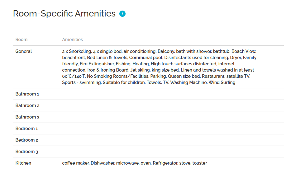 Rentals United Il permet également d'obtenir des informations de base sur l'agencement de l'établissement, le nombre et la composition des chambres, ainsi que sur les équipements disponibles dans l'établissement.