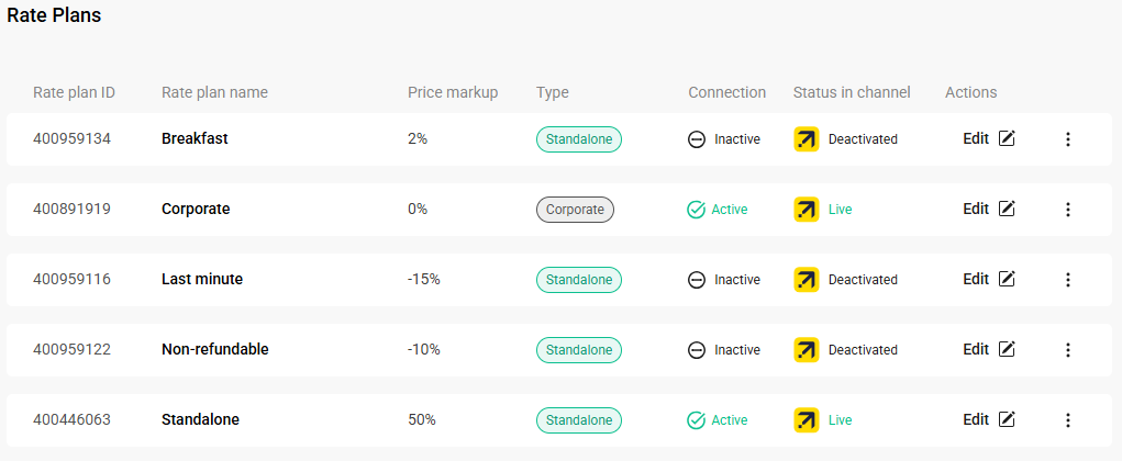 Chaque fois que vous ajoutez un plan tarifaire existant à un type de chambre, nous créons une copie distincte de ce plan tarifaire. Le nouveau plan tarifaire héritera de tous les paramètres, mais ne sera en aucun cas lié au plan tarifaire d'origine. Si vous souhaitez apporter des modifications, veillez à éditer chaque plan tarifaire séparément.