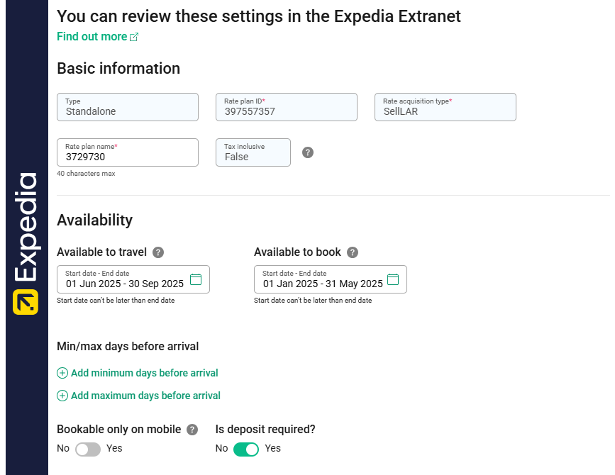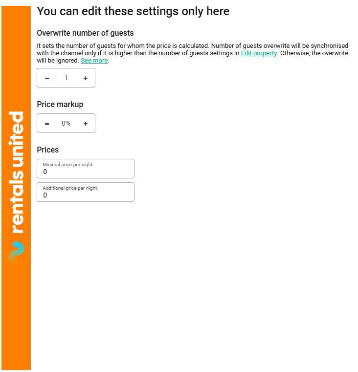 Vous pouvez définir quand et comment afficher ce plan tarifaire aux invités. Les données sont synchronisées avec Expedia, ce qui signifie qu'elles sont toujours à jour (même si elles sont éditées sur Expedia). Vous pouvez modifier les données sur Rentals United et elles seront mises à jour sur Expedia.
