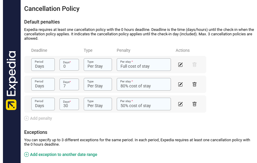 Période d'exception - période pendant laquelle des conditions d'annulation différentes s'appliquent. Vous pouvez spécifier jusqu'à 3 exemptions différentes pour la même période. Pour chaque période, Expedia exige au moins une politique d'annulation avec un délai de 0 heure.