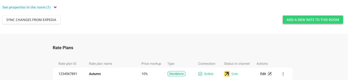 Je ne suis pas sûr que ce que vous voyez actuellement sur Rentals United corresponde à votre configuration actuelle sur Expedia? Vous pouvez synchroniser les détails du plan tarifaire à partir de Expedia et actualiser la vue dans Rentals United. C'est un moyen de s'assurer que vous travaillez sur la configuration actuelle et que les changements récents effectués dans l'extranet Expedia sont reflétés dans Rentals United.