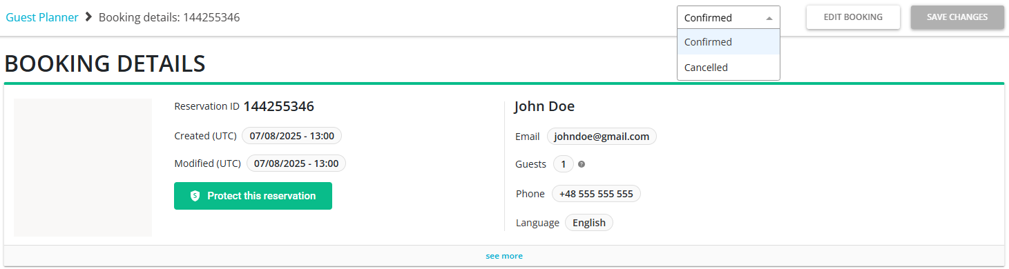 Lorsqu'une réservation est reçue, Homes & Villas by Marriott Bonvoy nous fournit les données personnelles standard de l'invité (nom, prénom, numéro de téléphone, etc.) et les détails de la réservation (nom de la propriété, nombre d'invités, date, prix). Certains canaux comprennent également des informations supplémentaires. Tous ces détails sont accessibles dans Guest Planner > Big Card ou via les méthodes API utilisées pour récupérer les réservations, par exemple Pull_ListReservations_RQ.