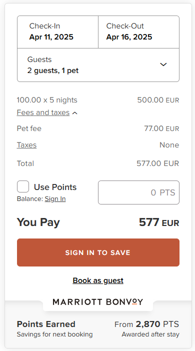 Les frais pour animaux de compagnie sont synchronisés avec Homes & Villas by Marriott Bonvoy dans les types de calcul suivants :